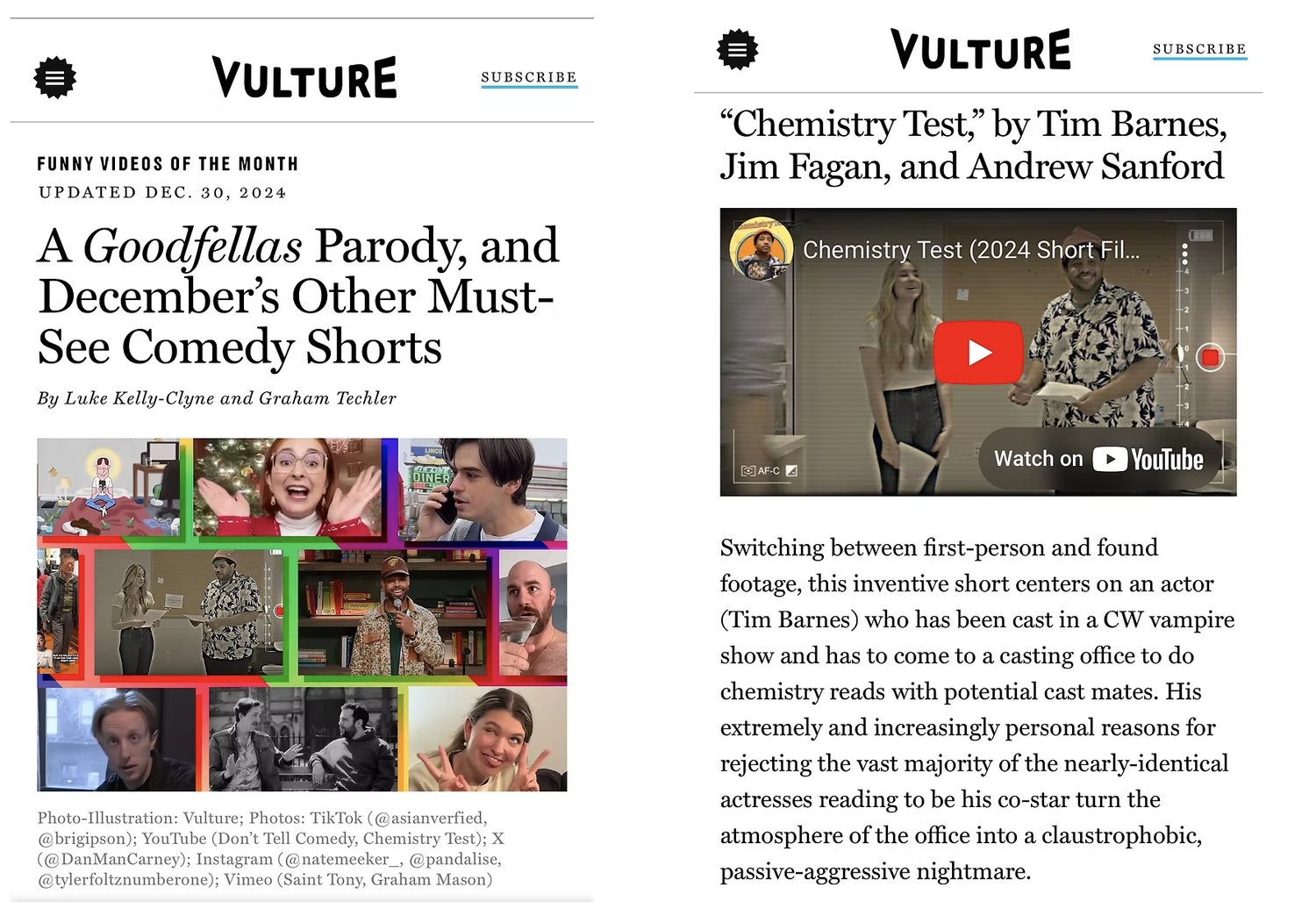 (Vulture, 2022) (Cosmic Log, 2022) (Vulture, 2020) (Chicago Magazine, 2015) (Splitsider, 2015) (Chicago Magazine, 2014)